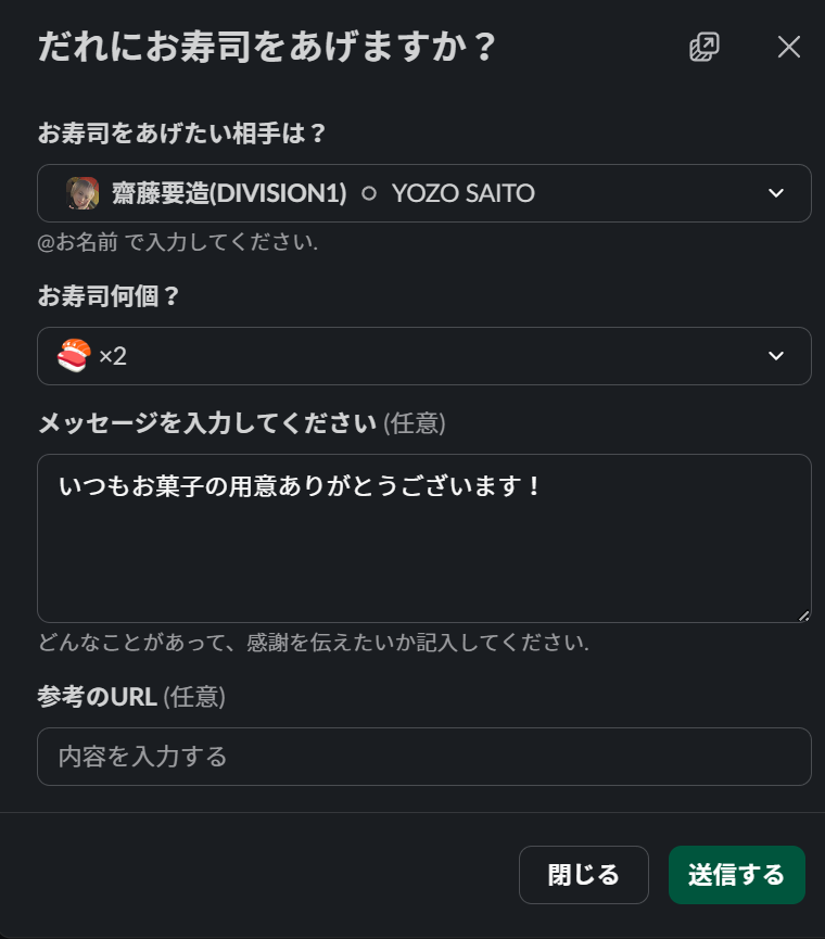 社内コミュニケーションツールである「Slack」の機能を利用した「お寿司🍣を送る」ワークフローの事です。